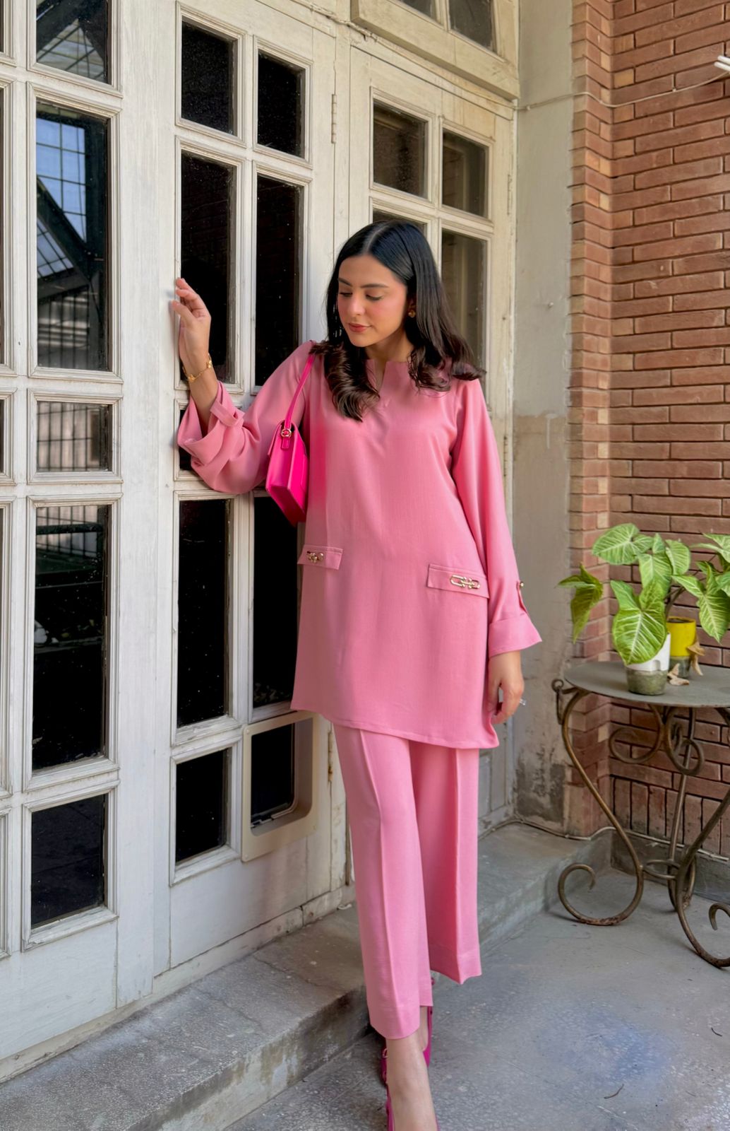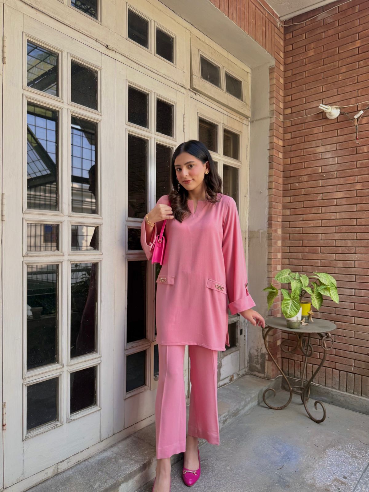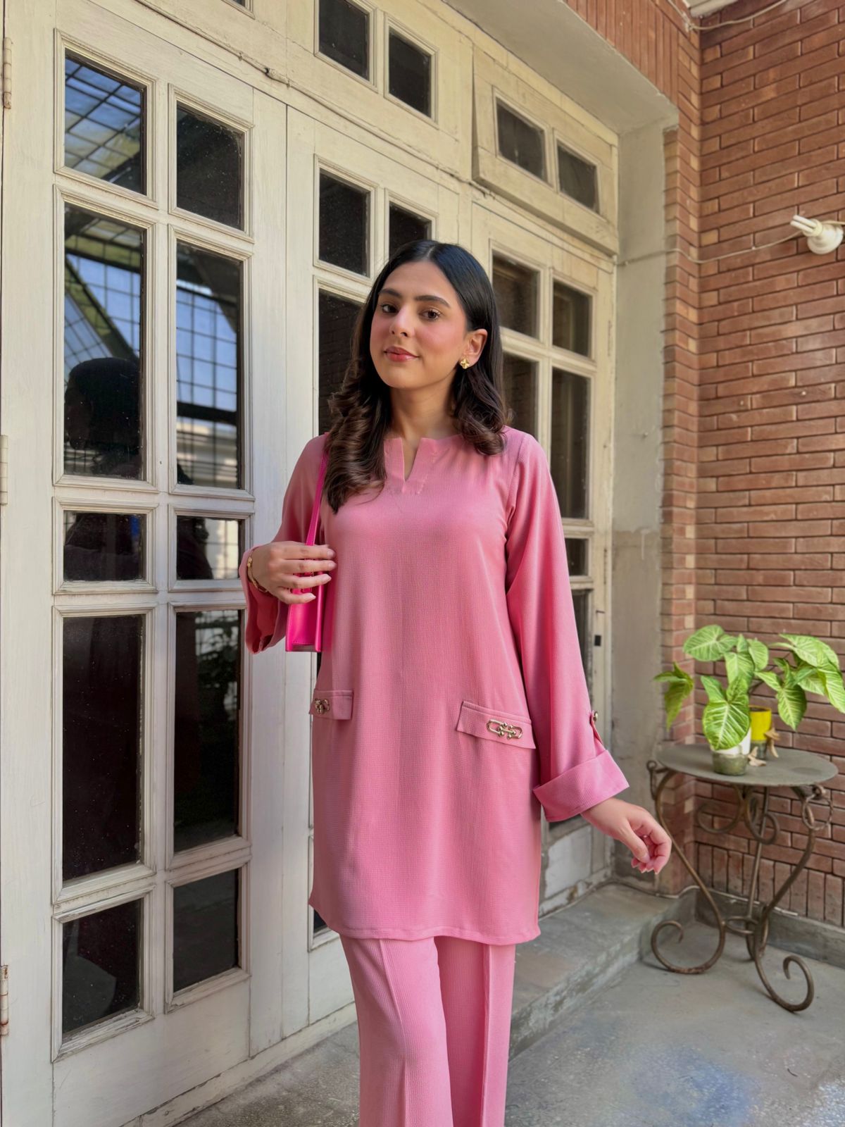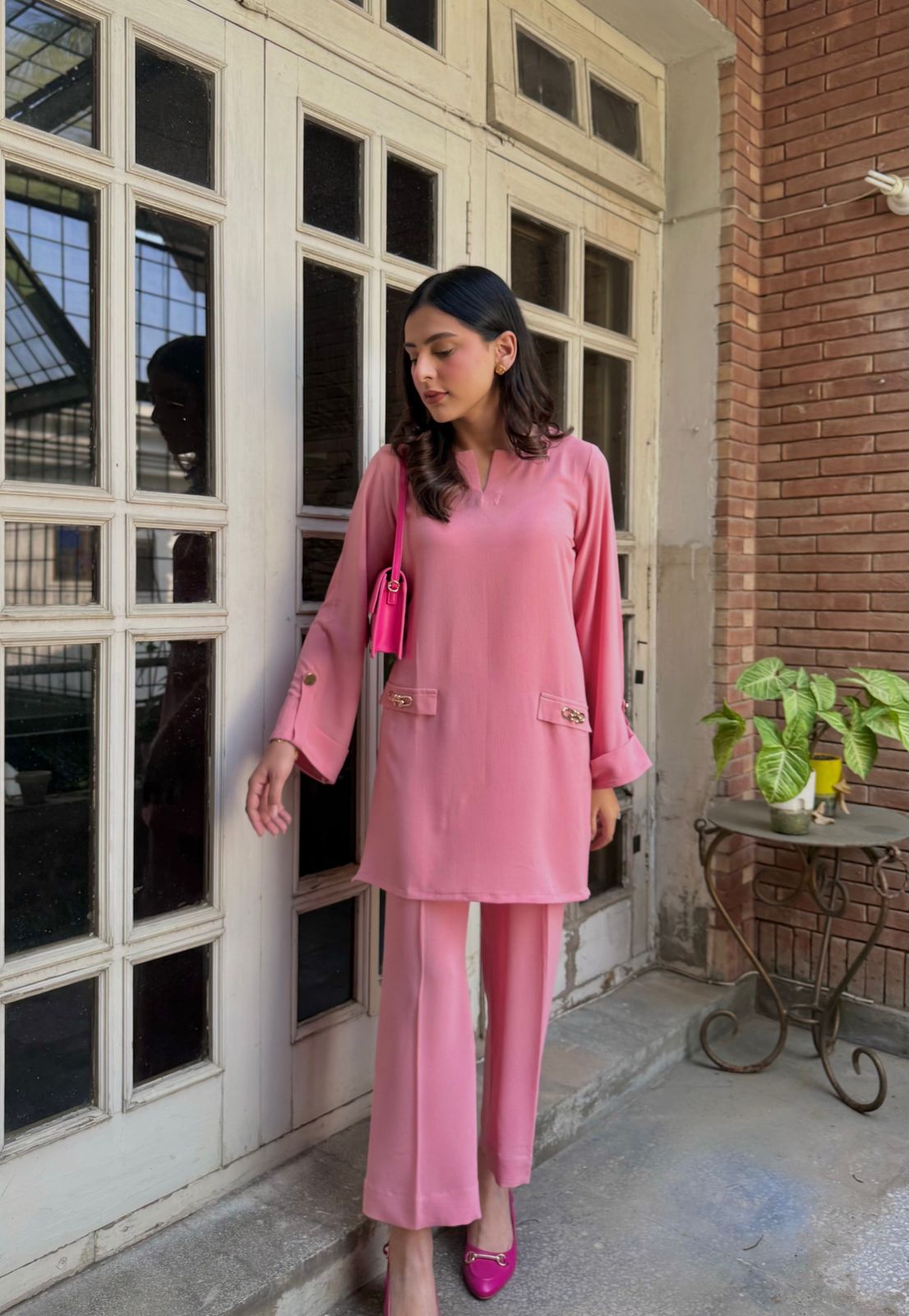Designed in a delicate rose hue that captures the essence of femininity. Crafted from premium triple georgette, this two-piece coord set is a gentle nod to timeless elegance with modern touch.