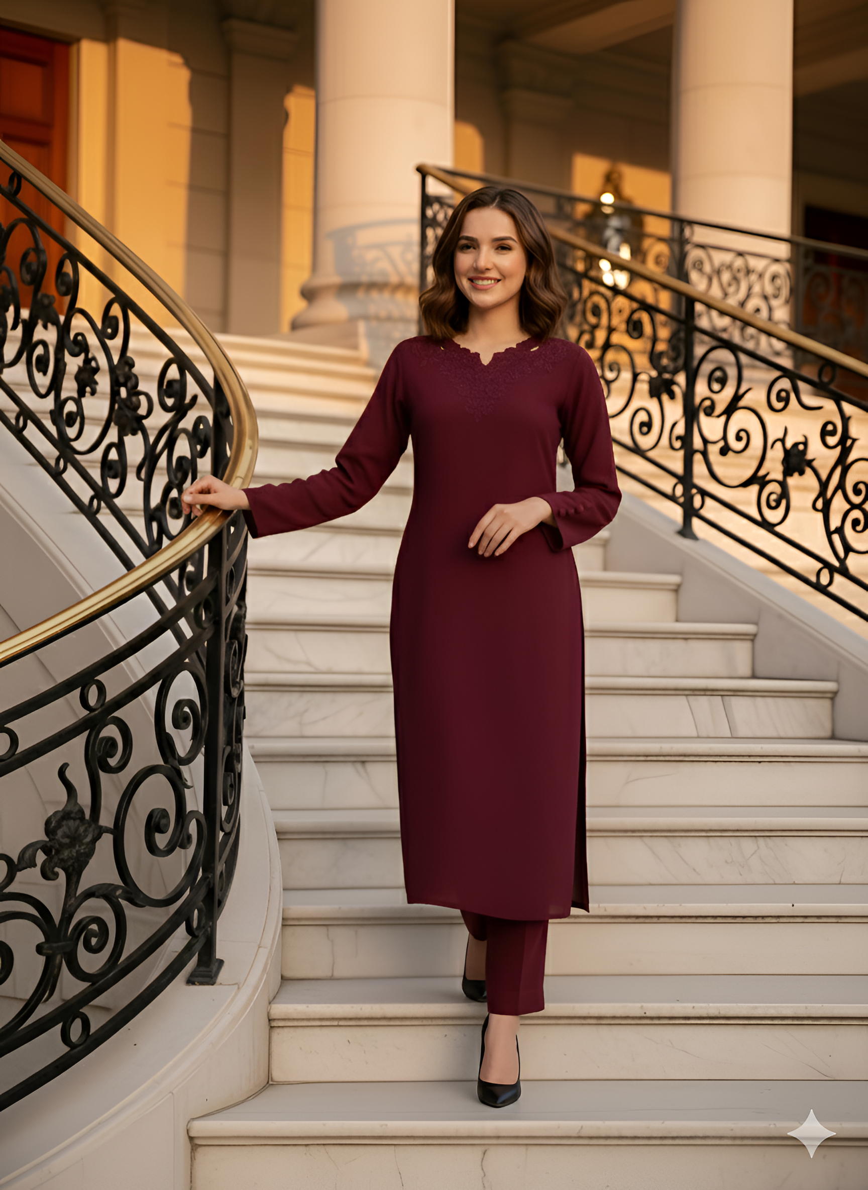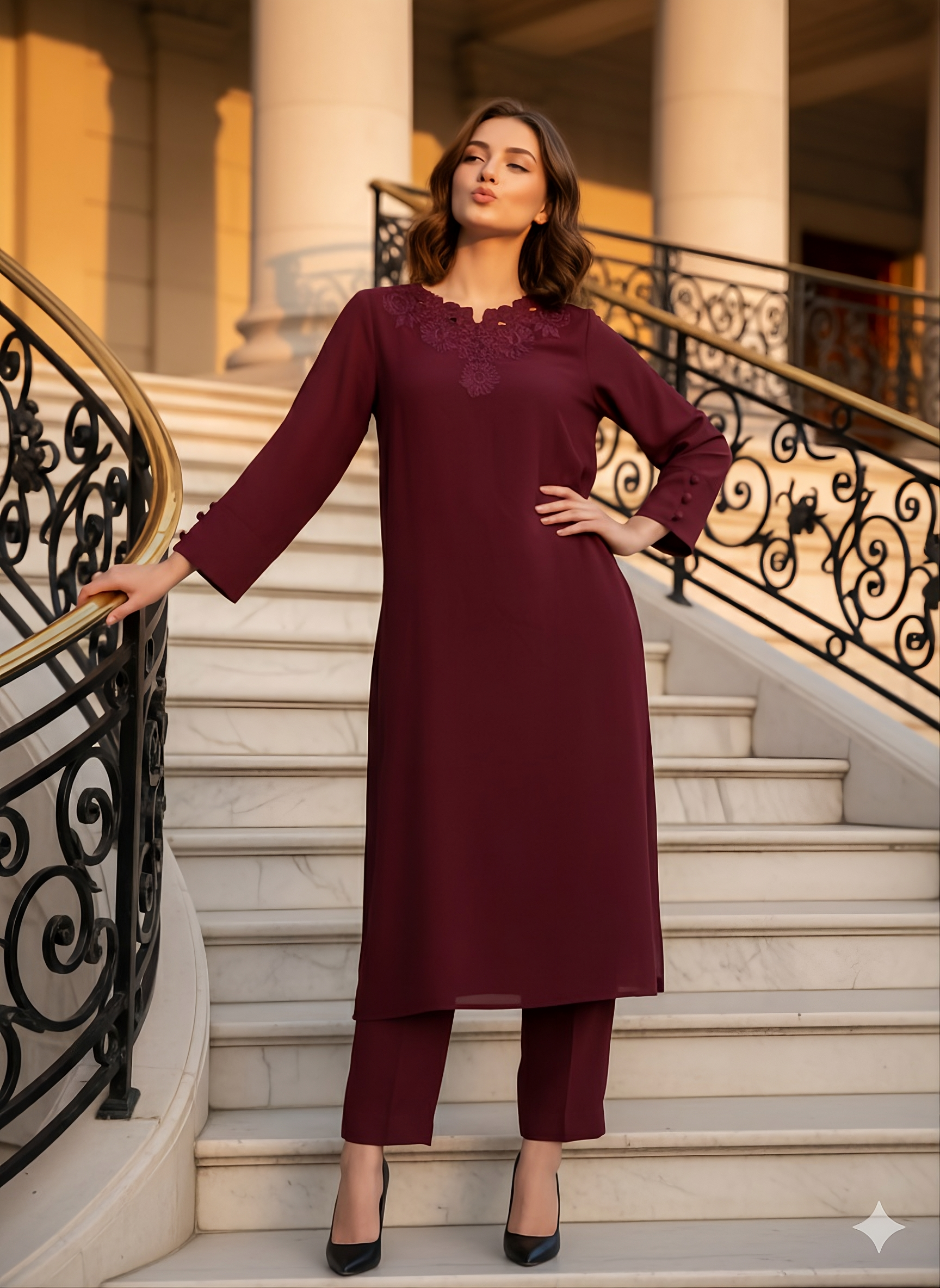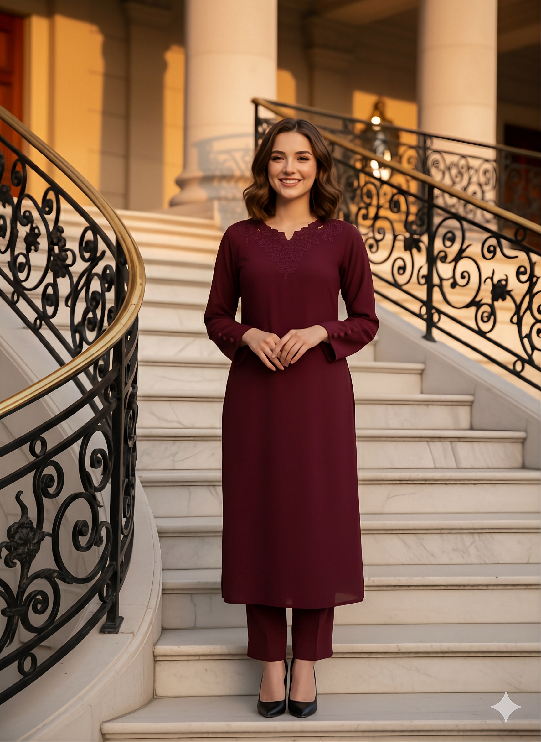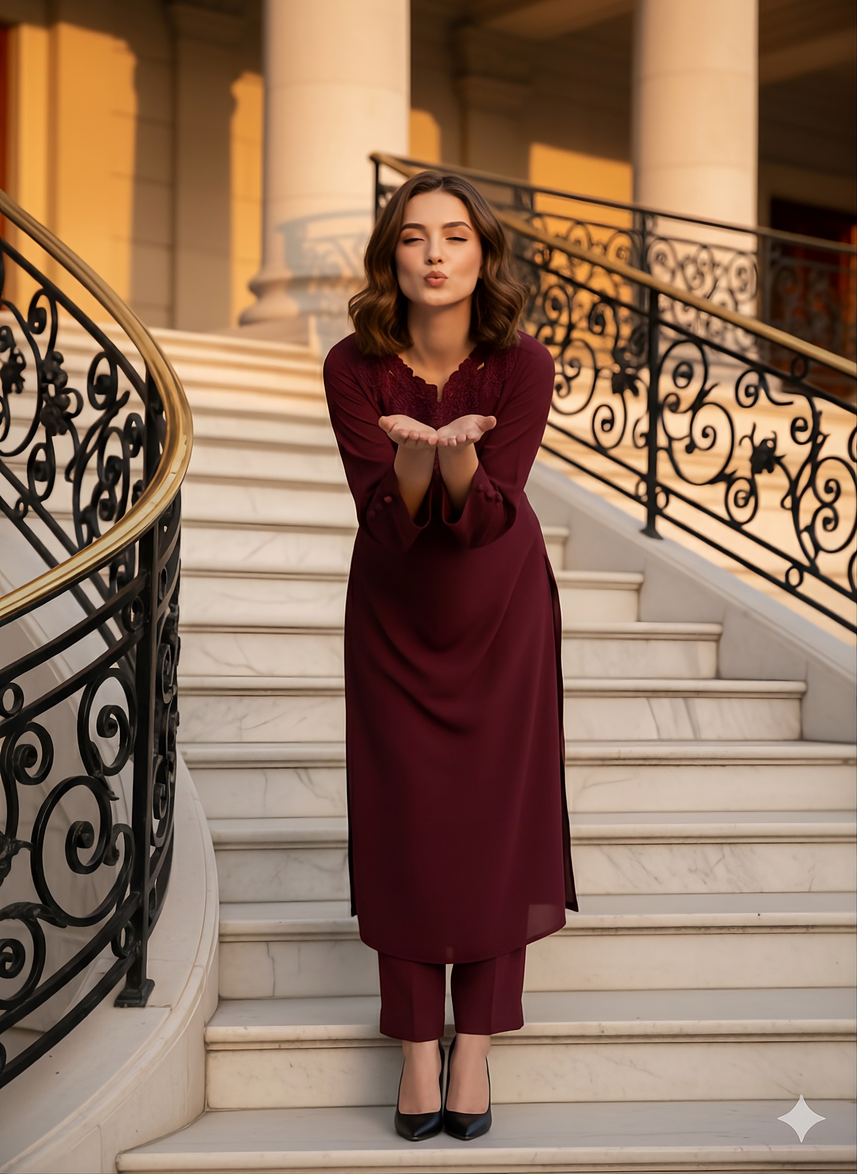 Description: Crafted in a burgundy hue, this timeless silhouette is accented with delicate tonal embroidery along the neckline, adding just the right touch of detail. Designed with a relaxed, flattering cut and paired with straight trousers, this ensemble embodies effortless elegance. Perfect for evenings, intimate gatherings, or refined everyday wear.