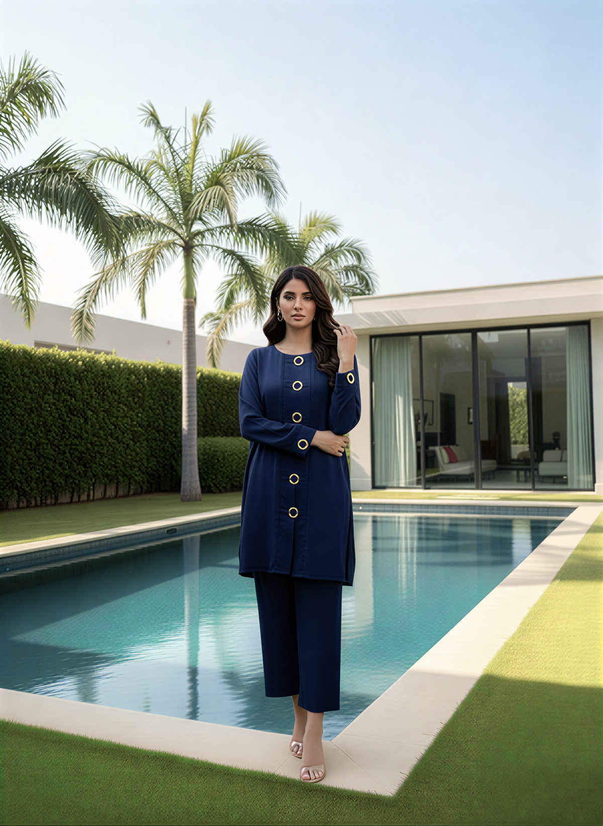 Description: A statement in modern sophistication, Midnight Orbit is tailored in a rich navy hue with a sleek, structured silhouette. The design is elevated with bold gold ring accents aligned along the front panel and sleeves. Featuring a clean round neckline and full-length sleeves, this piece is paired with matching color trousers to complete the look.