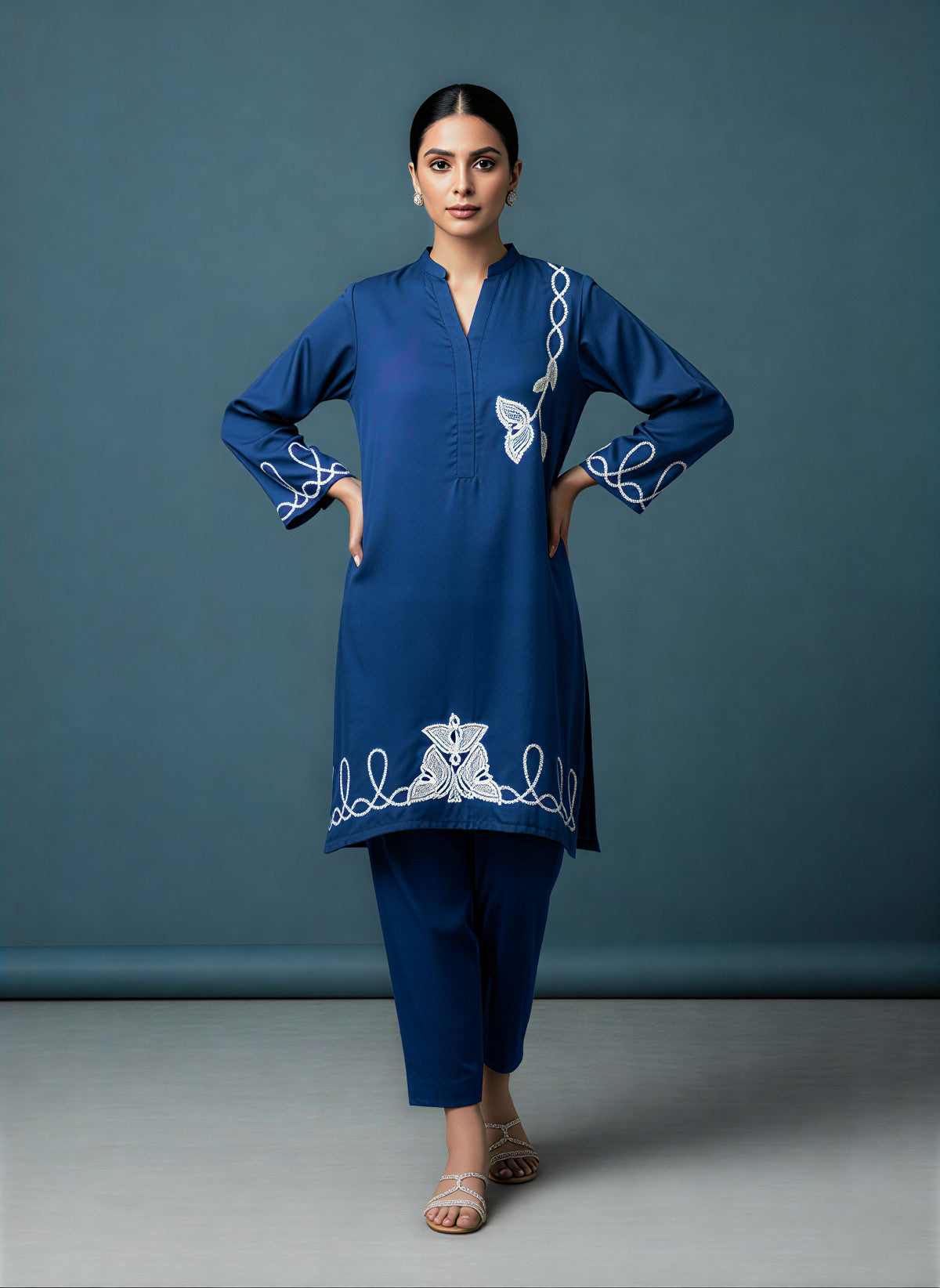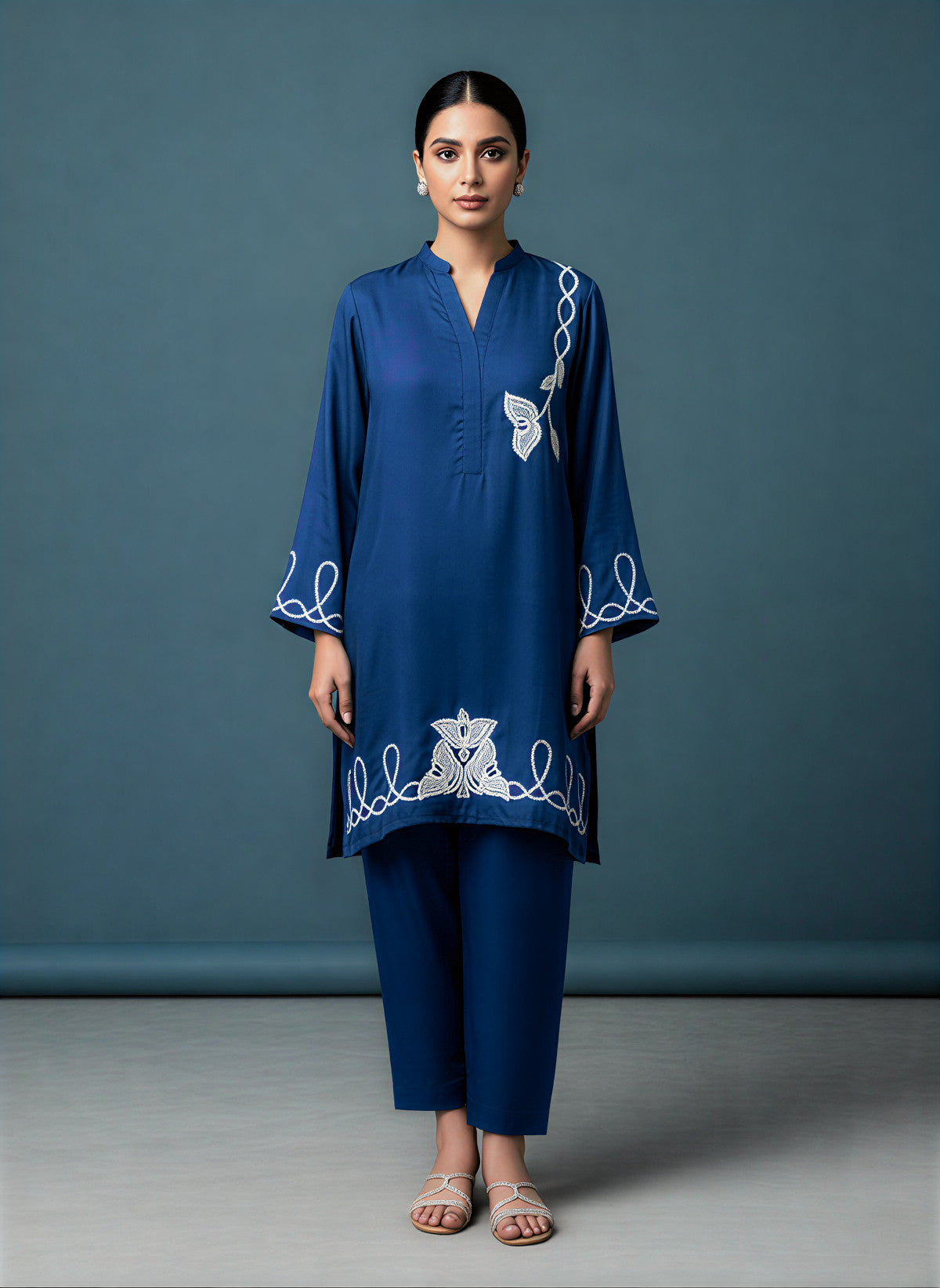 Description: A refined expression of effortless elegance, Azure Vine is crafted in a rich navy-blue hue that exudes quiet sophistication. The silhouette is enhanced with intricate ivory embroidery that traces gracefully along the shoulder, sleeves and hem. This piece offers timeless appeal, perfect for polished daytime wear or intimate evening gatherings.
