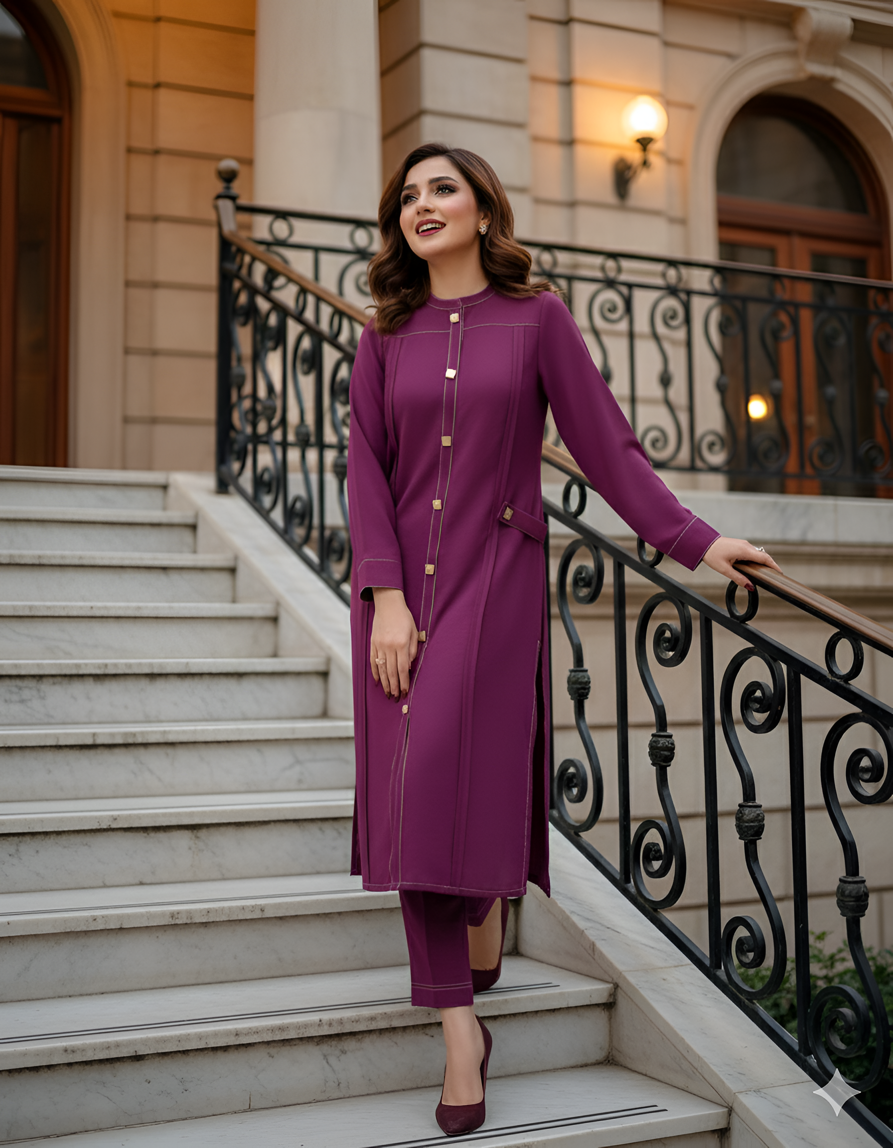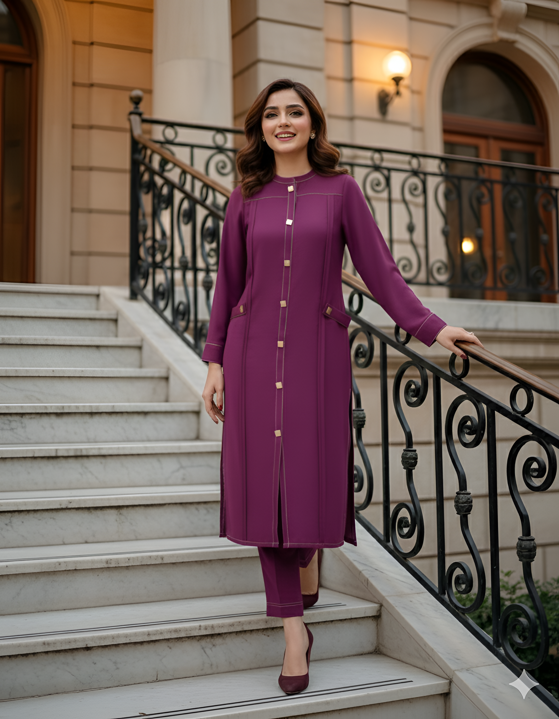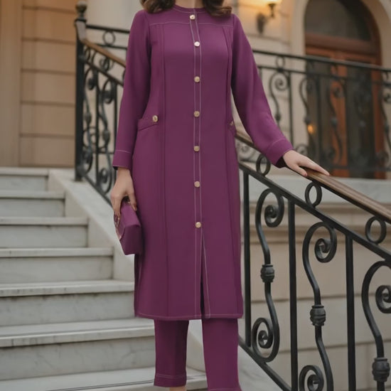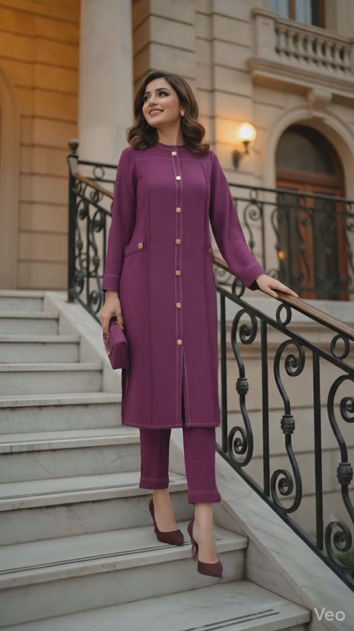 Description: Crafted in a rich plum hue, the straight-cut shirt features clean panel detailing with subtle contrast stitching and statement front buttons that add structure and sophistication. Finished with sleek pockets and paired with matching straight trousers, this ensemble is perfect for formal wear, workdays, or graceful evening occasions.