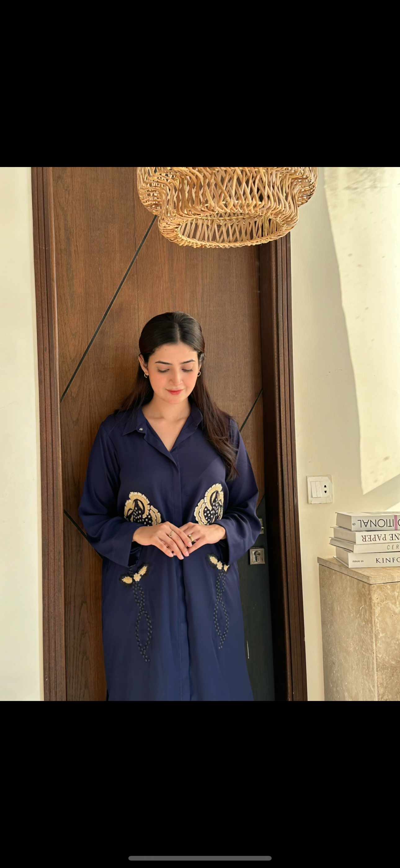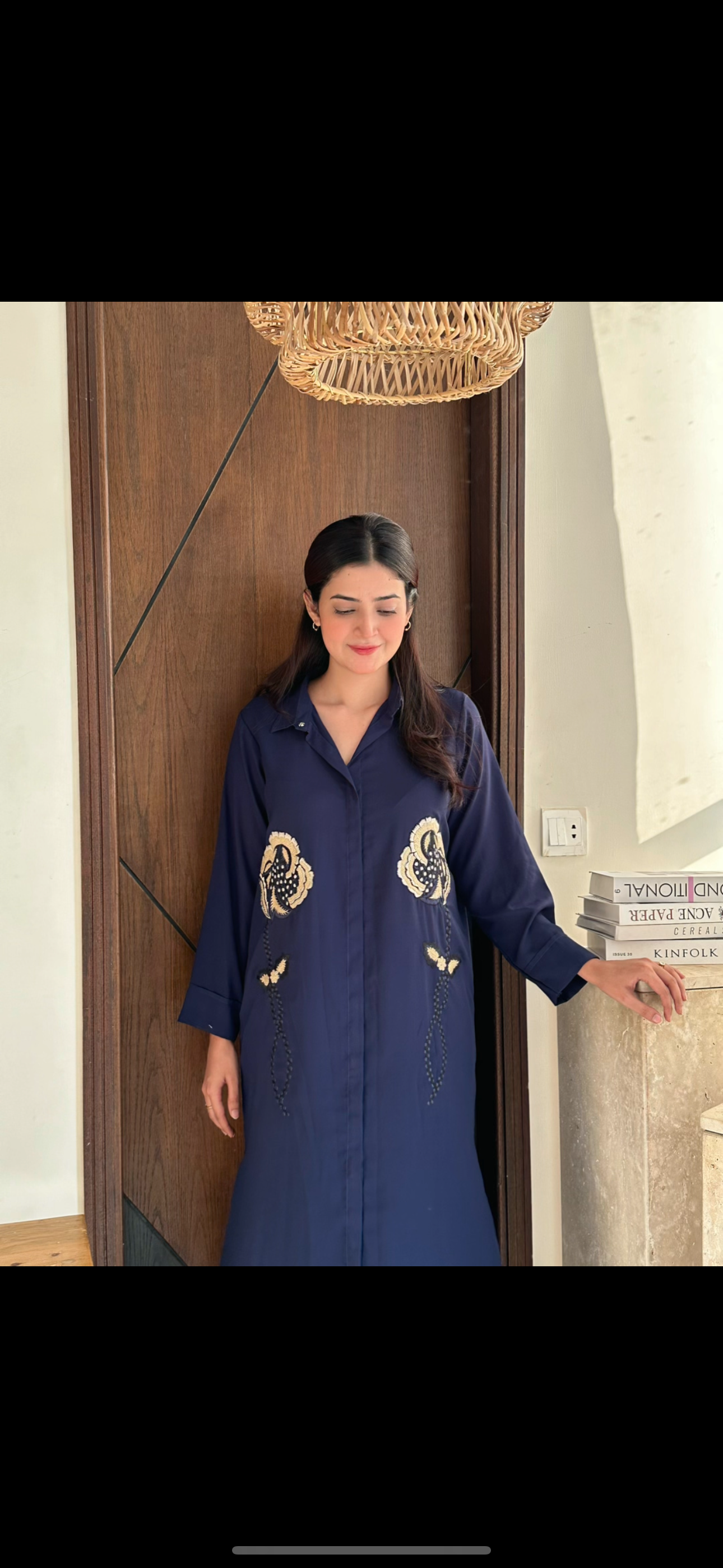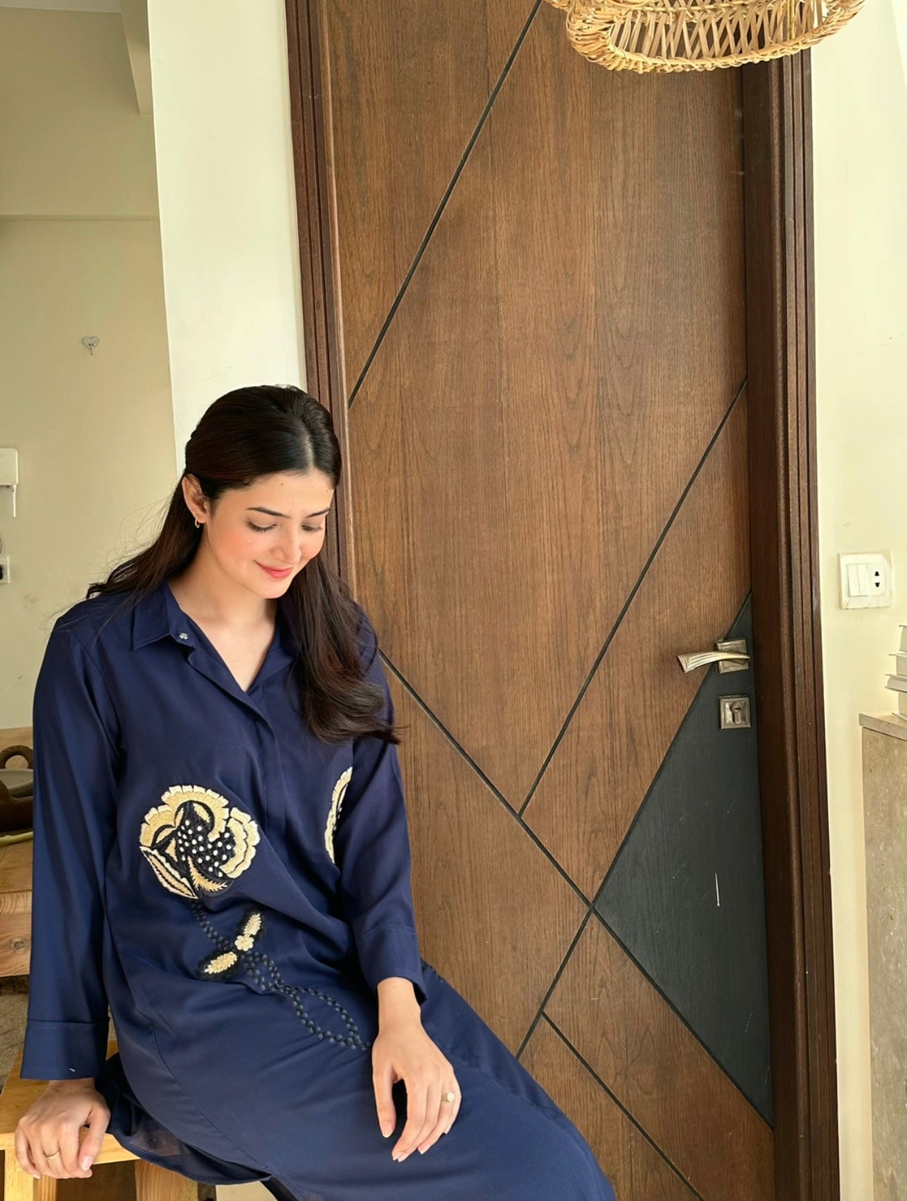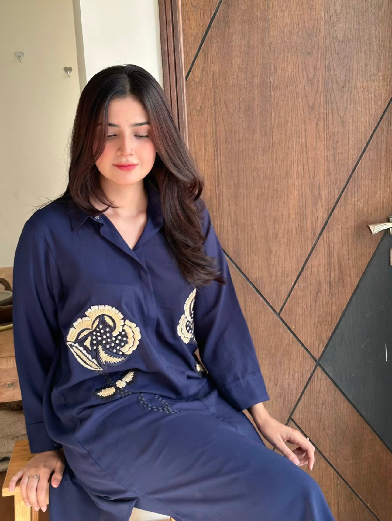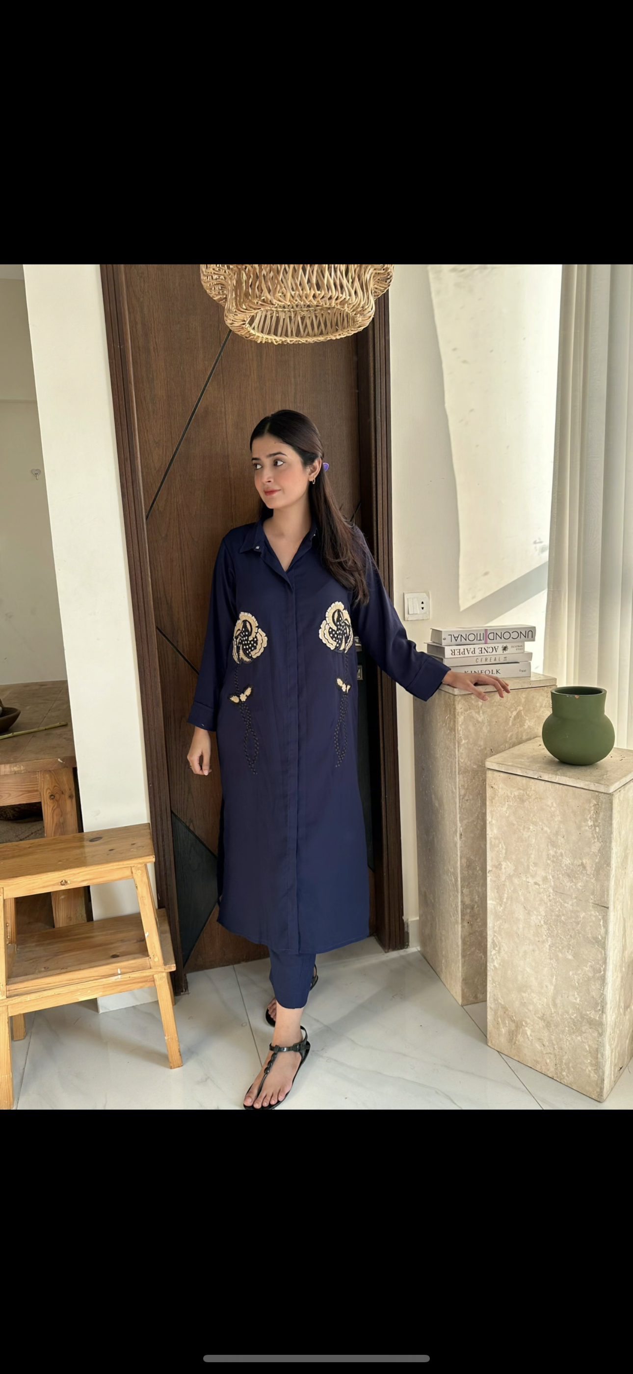 Elevate your everyday style with Sapphire dusk, a deep navy-blue co-ord set crafted from luxurious Korean crepe. The long, straight-cut kurta features intricate beige floral embroidery that adds a touch of timeless elegance. Paired with sleek matching trousers, this ensemble combines refined design with effortless comfort. A perfect choice for days that call for effortless elegance.