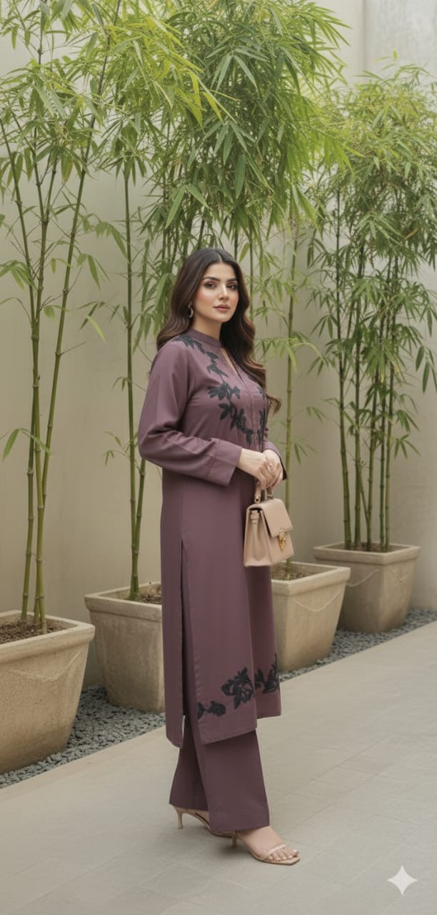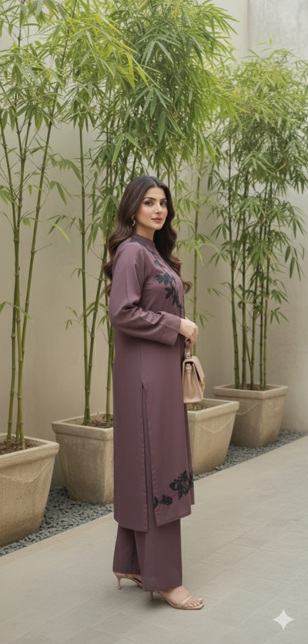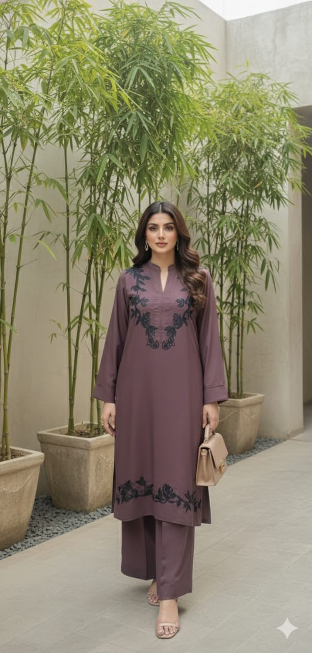 Discover effortless sophistication with this elegant brown ensemble, designed for women who love subtle luxury. The kurta features intricate black embroidery along the neckline and hem, creating a striking contrast that adds depth and refinement to the look. Its graceful silhouette and soft fall offer all-day comfort while maintaining a polished appearance. Paired with matching straight trousers, this outfit blends modern minimalism with timeless Eastern charm. Perfect for luncheons, office wear, or transitional seasonal styling, it brings a serene yet stylish statement to your wardrobe.